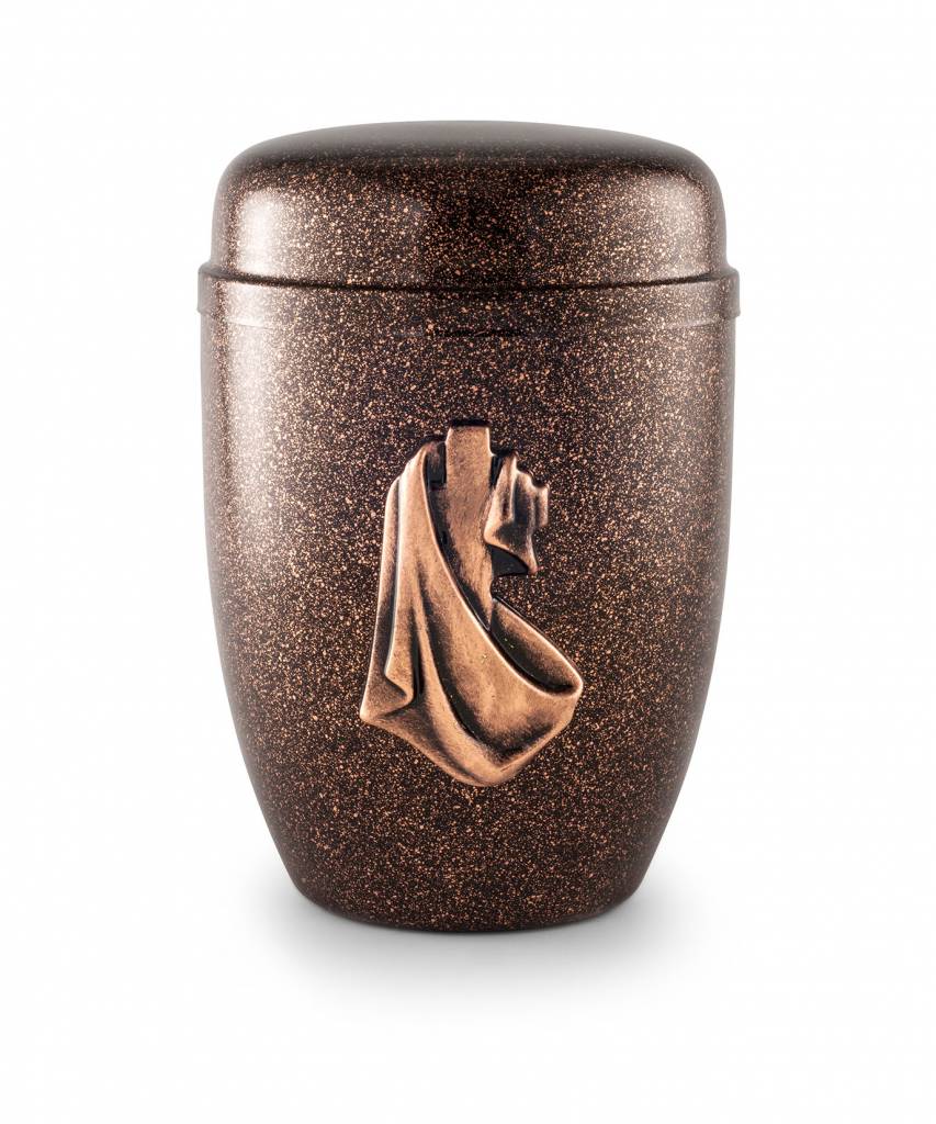 De 'Asbus mantel en kruis - staal' is een mooie stalen urn met een traditionele vormgeving, prachtig in haar eenvoud. De basiskleur van deze stalen urn is koper en zwart met een mooie en decoratief bronzen mantel en kruis embleem. De 'Asbus mantel en kruis - staal' is 0,90 Kg zwaar, 27 cm hoog en heeft een doorsnede van 18 cm. Deze urn is geschikt voor binnen plaatsing. Prachtige urnen van metaal bij UitvaartUniq.nl!