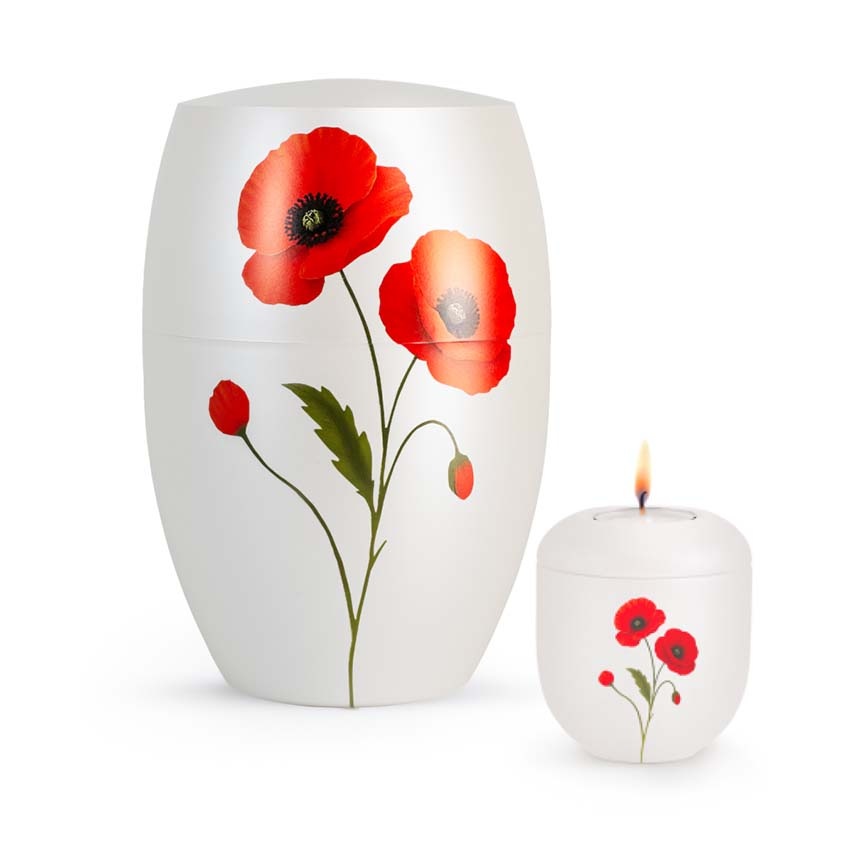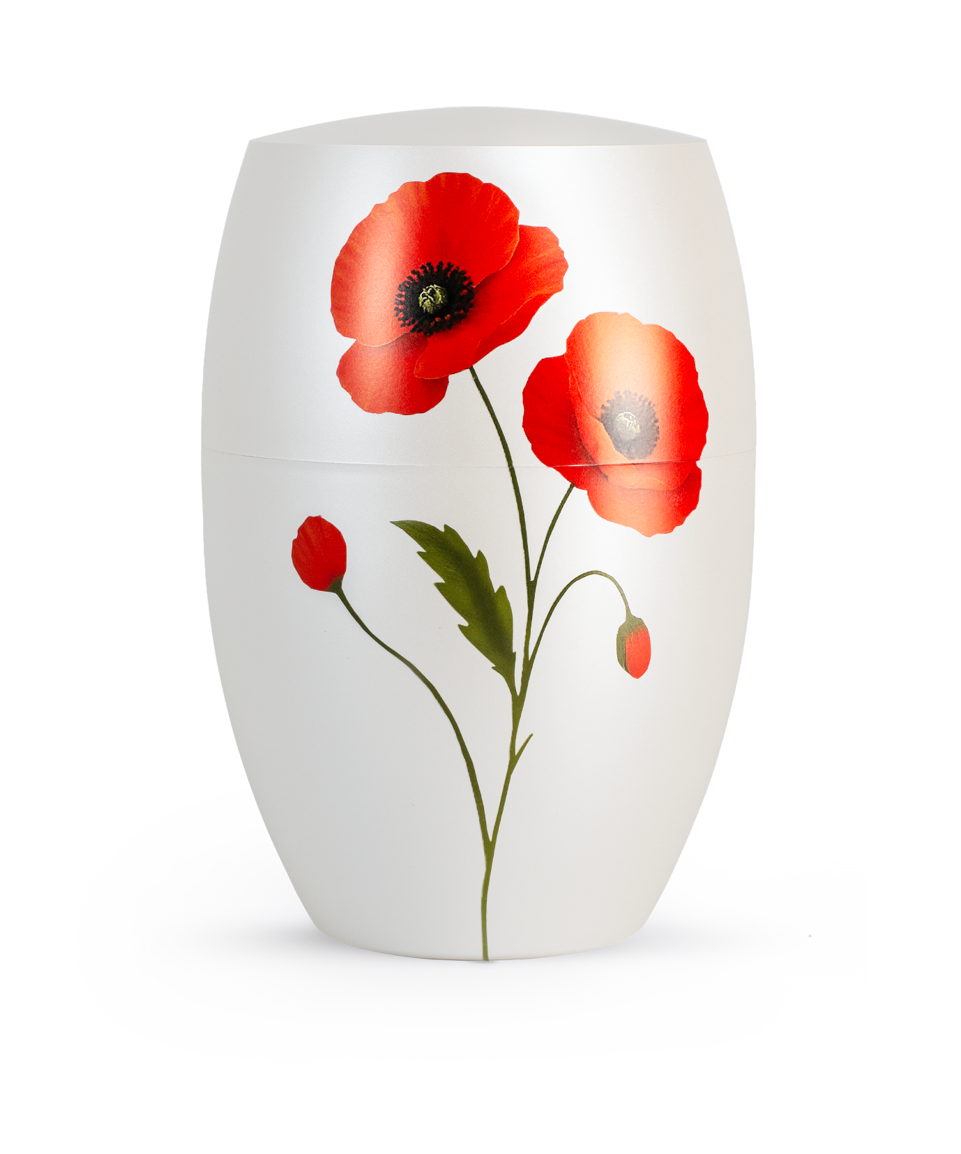 De opvallende klaproos in diep rood vormt een krachtig symbool. Rood staat voor energie, actie en hartstocht. De klaproos wordt bovendien geassocieerd met geestelijke kracht en de vergankelijkheid van het leven: een bloem die naar het licht groeit, maar ook weer vervaagt. Zo verenigt deze urn symboliek van liefde en afscheid in één stijlvol gedenkobject.
