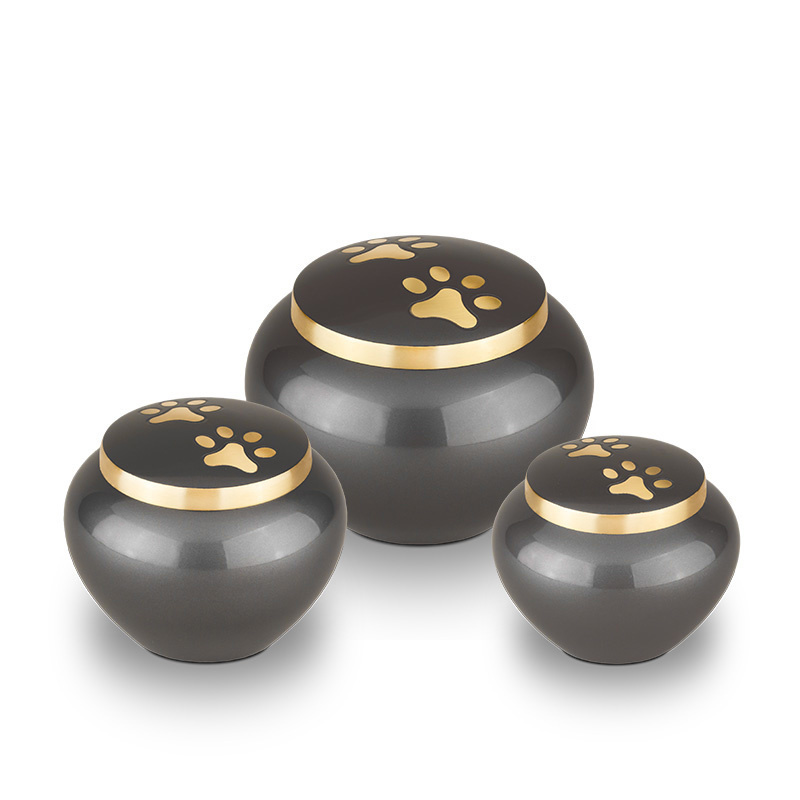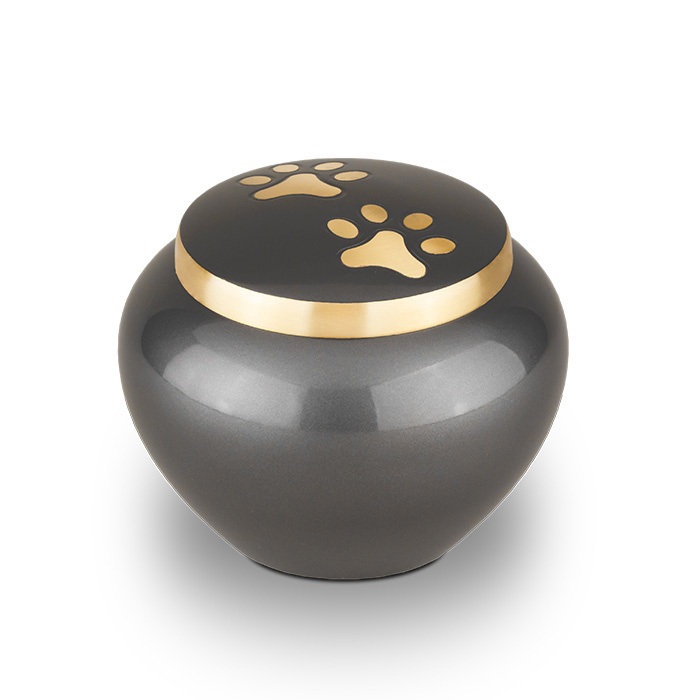 De dieren urn 'Dieren urn Rondo antraciet & goudkleurig' M heeft een antraciete, glanzende basiskleur met goudkleurige pootafdrukken. De 'Rondo antraciet & goudkleurige' heeft een rond schroefdeksel die voorzien is van een goudkleurige sierstrip en twee goudkleurige pootafdrukken. De urn heeft een hoogte van 11 cm, een inhoud van 0,7 L en weegt 0,6 Kg. De inhoud van deze dierenurn is geschikt voor het bewaren van een hoeveelheid as of een haarlok van uw geliefde huisdier.