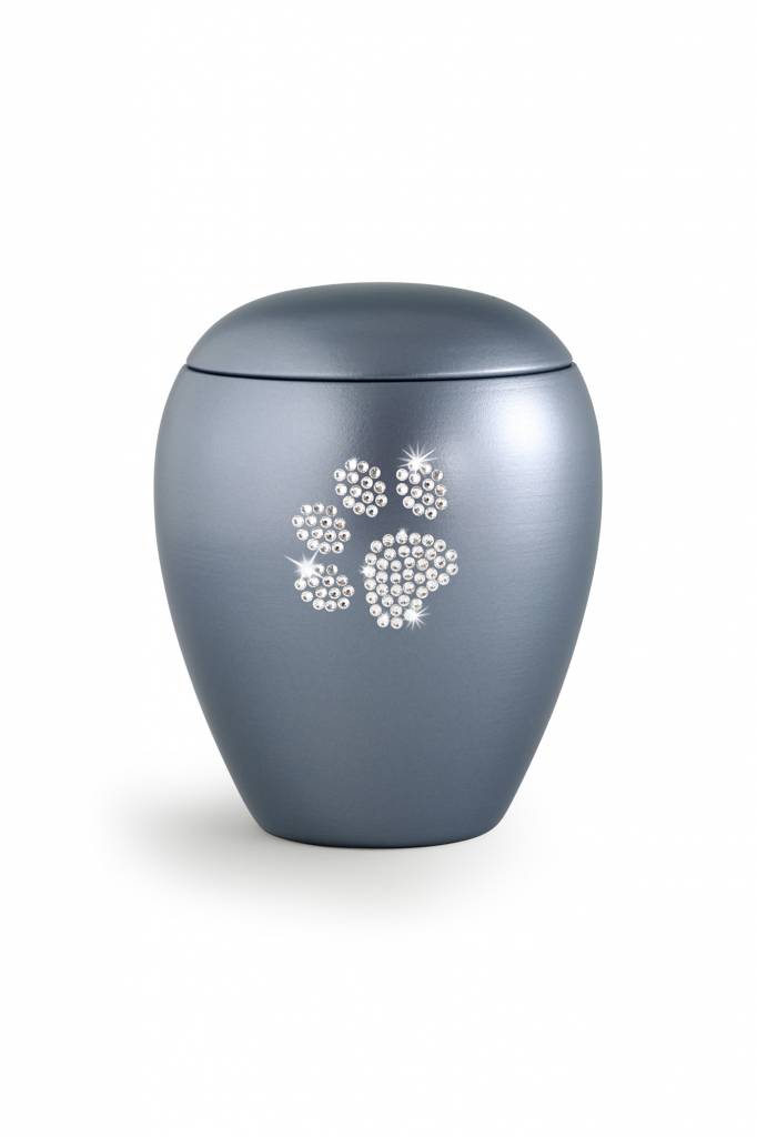 De 'Dierenurn blauwgrijs met swarovski pootafdruk middel - keramiek' is een mooie dieren urn waarmee u de as van uw overleden dierbare trouwe maatje een mooie plek kunt geven. Deze keramische dieren urn heeft een traditionele vormgeving, gecombineerd met een zachte blauwgrijze kleur , waarmee de urn zowel rust als waardigheid uitstraalt. Het bijzondere aan deze urn is de mooie afbeelding van een pootafdruk met Swarovski steentjes. Een prachtige vorm van asbestemming en zeer geschikt om de mooie herinneringen aan uw dierbare huisdier in leven te houden en vooral ook tastbaar te maken. De 'Dierenurn blauwgrijs met swarovski pootafdruk middel - keramiek' is 16,5 cm hoog, een diameter van 12.5 cm en heeft een inhoud van 1,5 L Deze urn, vervaardigd in traditionele urn vorm, is geschikt voor binnen plaatsing.