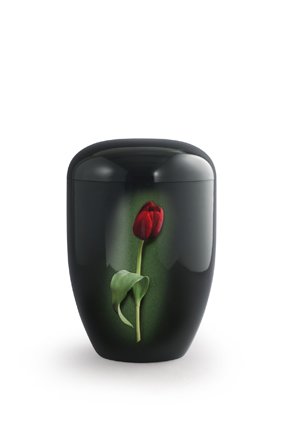 De 'Eco urn zwart met rode tulp - bio' is zwart van kleur en voorzien van een afbeelding van een mooie, rode tulp. De urn is 27,5 cm hoog, weegt 0.50 Kg en heeft een diameter van 18.50 cm. U kunt er ook voor kiezen om deze unieke urn in eerste instantie een mooi plekje in huis te geven, alvorens u de urn gaat begraven in de aarde. Afscheid nemen hoeft dus niet meteen, u kiest zelf het juiste moment uit. Prachtige biologische urnen, voor een Eerlijke prijs bij UitvaartUniq.nl.