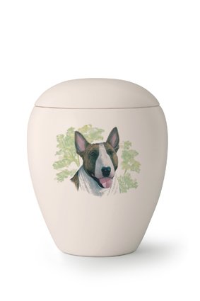 Een prachtige urn voor uw dierbare Bull Terriër . Een mooie, duidelijk herkenbare dierenurn waarmee u de as van uw overleden dierbare trouwe maatje een mooie plek kunt geven. Deze keramische honden urn heeft een traditionele vormgeving, gecombineerd met een zachte en lichte kleur, waarmee de urn zowel rust als waardigheid uitstraalt. Het bijzondere aan deze urn is dat er een mooie afbeelding van een Bull Terriër weergegeven wordt. Deze honden urn is dus heel duidelijk herkenbaar als 'dierenurn voor een Bull Terriër'. Een prachtige vorm van asbestemming en zeer geschikt om de mooie herinneringen aan uw dierbare hond in leven te houden en vooral ook tastbaar te maken.