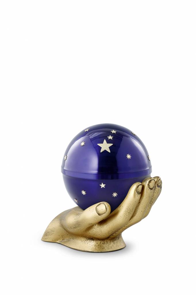 De 'Kinder mini urn gedragen sterrenhemel blauw - messing' is een prachtige kinder mini urn van messing, rondvormig, speels, maar toch met een moderne uitstraling. Deze unieke kinderurn is ontworpen met een blauwe sterrenhemel als middelpunt, met daarin een motief van sterren. De mini urn wordt gedragen door een messingkleurige hand. Samen een prachtig geheel. De 'Kinder mini urn gedragen sterrenhemel blauw - messing' heeft een hele liefdevolle, warme en tedere uitstraling; Een bijzondere & tastbare herrinnering aan uw overleden kind. Deze kinderurn is 12,5 cm hoog, heeft een diameter van 10 cm en een inhoud van 0,5L. Deze urn is ook verkrijgbaar in variant waarbij de urn op een goudkleurig voetstuk staat (niet wordt gedragen door twee handen). Indien u deze urn toch graag wilt voorzien van een persoonlijke inscriptie, kunt u kiezen voor een prachtige urntegel.