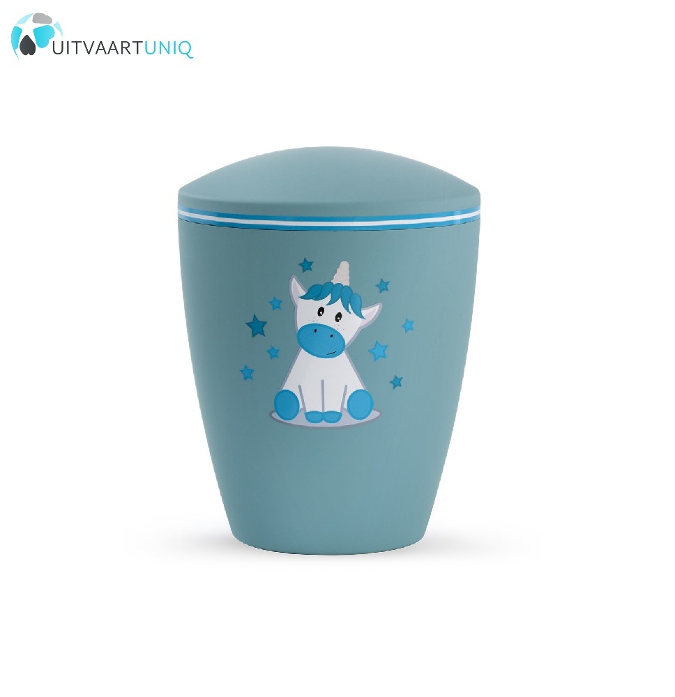 Deze ecologische / biologische urn is gemaakt van plantaardige componenten, 100% afbreekbaar. Eenmaal in de aarde begraven zal deze bio urn, afhankelijk van de weersomstandigheden, geleidelijk afbreken totdat deze uiteindelijk, samen met de as van uw overleden dierbare, volledig opgenomen wordt door de aarde. Op deze manier zal de as van uw overleden dierbare 'teruggegeven' worden aan de natuur, zonder schade te veroorzaken aan het milieu. De 'Kinder urn eenhoorn turkoois - bio' is een moderne, liefdevolle en zacht aanvoelende bio kinder urn. Deze urn heeft een mooie turkooise kleur en een afbeelding van een eenhoorn. De 'Kinder urn eenhoorn turkoois - bio' heeft een hoogte van 15 cm, een doorsnede van 11,5 cm, inhoud van 1 liter en weegt 0,30 kg.