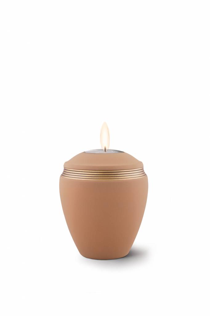 De 'Mini urn helena zandkleur met herdenkingslichtje - keramiek' is een prachtige handgemaakte keramische urn met een bijzondere vormgeving, natuurlijke uitstraling en met een waxinelichthouder. De vijf gouden sierringen geven deze urn bijzonder accent. Met deze bijzondere 'urn met kaarsje' kunt u, ter herinnering aan uw overleden dierbare, af en toe een kaarsje aansteken om stil te staan bij de mooie & dierbare momenten. Deze prachtige keramische urn is 12 cm hoog, heeft een doorsnede van 9,5 cm en is geschikt voor binnen plaatsing.