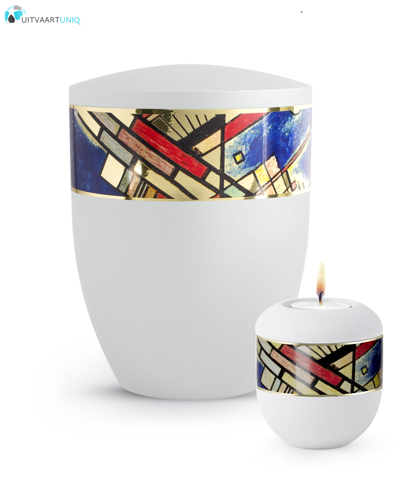 Deze moderne urnen uit de abstracte editie hebben omringende motieven met hoogglans gouden accenten. De kunstwerken bestaan voornamelijk uit geometrische vormen. De contrasterende vormen en kleuren zorgen ervoor dat de werken dynamisch en modern overkomen.