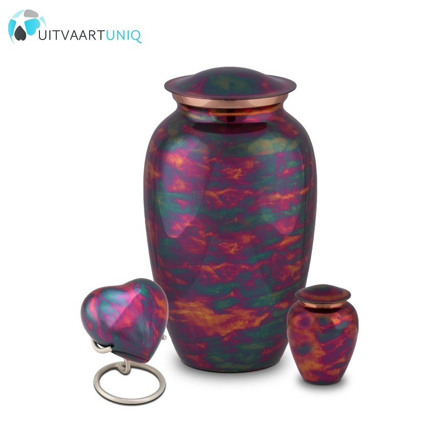 De 'Mini urn oliekleur - messing' is een prachtige mini urn van messing, heel mooi gedecoreerd met een prachtig kleurenpalet. De urn is voorzien van een kopermat look. Een bijzondere techniek waaruit fascinerende kleuren ontstaan. Hierdoor is iedere urn voorzien van fraaie kleurovergangen en kleurcombinaties. De urn heeft een traditionele vormgeving. De 'Mini urn oliekleur - messing' is 7 cm groot, weegt 0,1 Kg en heeft een inhoud van 0,05 L voor een kleine, symbolische hoeveelheid as, een haarlok, of een beetje zand uit het graf.