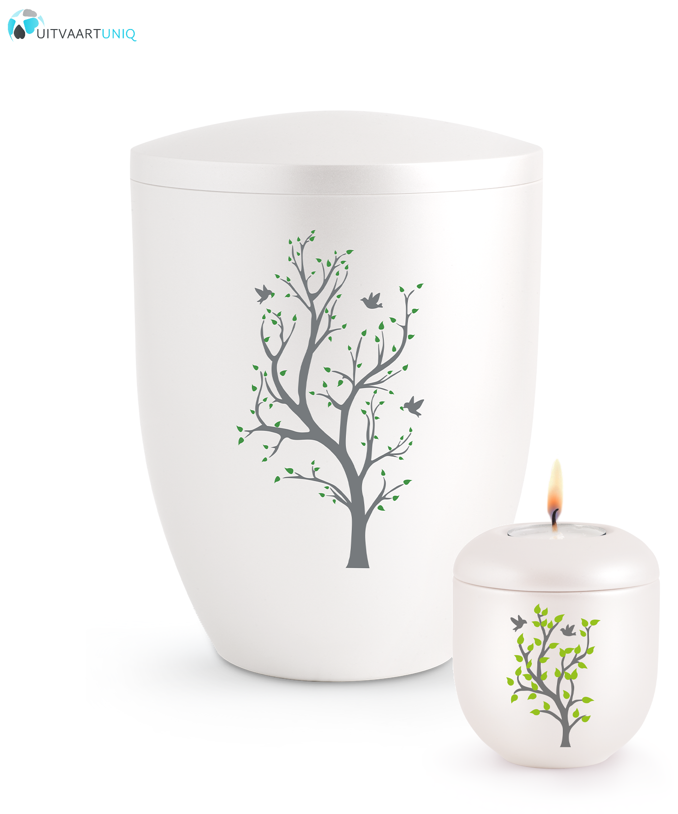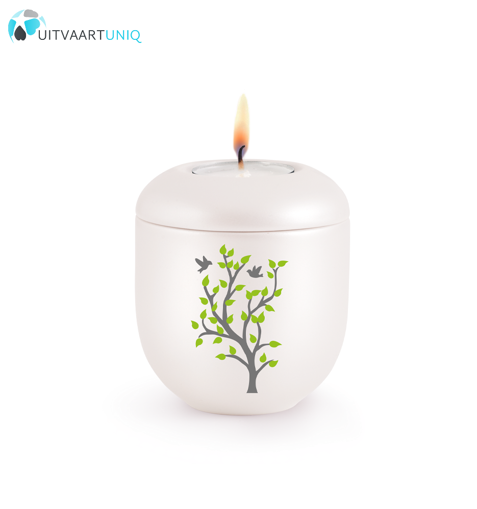 Ook leverbaar: een biologisch afbreekbare urn in de zelfde stijl. Het is een prachtige optie voor wie op zoek is naar een herdenkingsmogelijkheid waarbij u een deel van uw overleden dierbare terug kan geven aan de aarde. U kunt zo altijd een klein deel van uw overleden dierbare in de mini urn met kaarsje bewaren als een kleinere herdenkingsmogelijkheid.