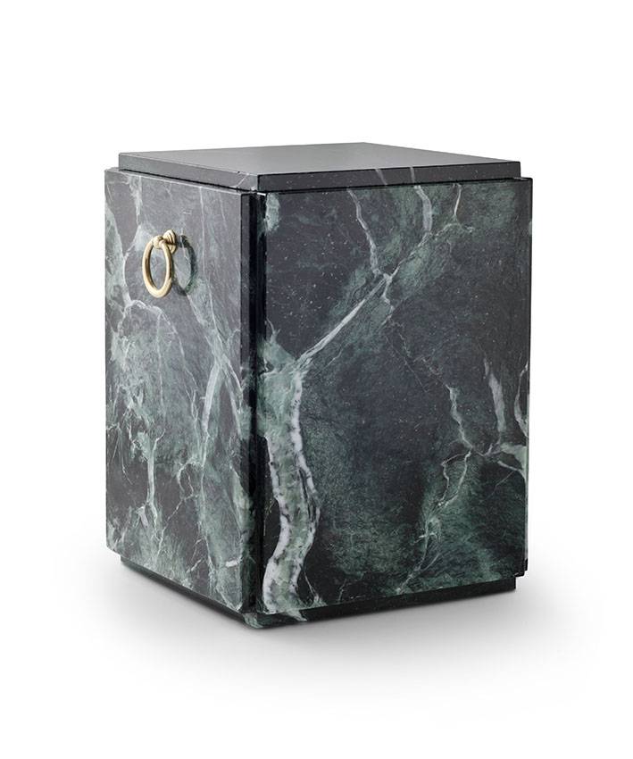 De 'Sarcofaag urn groen zwart - marmer' is een prachtige marmeren urn, een 100% natuurproduct. De Sarcofaag is uit één blok gehaald en vervolgens van binnen mooi afgewerkt en van buiten zorgvuldig gepolijst. Deze prachtige marmeren urn combineert een strakke rechthoekige vormgeving met de prachtige natuurlijke en unieke schakeringen van het marmer. De metalen hengsels geven vervolgens een extra dimensie aan de urn. De 'Sarcofaag urn groen zwart - marmer' is is 30 cm hoog, weegt 13 Kg en met een diameter van 21,5 cm is deze urn veelal geschikt voor het bewaren van de volledige hoeveelheid as van overleden dierbare. Deze mooie urn is geschikt voor binnen plaatsing, maar ook voor buiten plaatsing in een urnenmuur of urnengraf. Daarnaast kunt u deze urn tevens laten voorzien van een persoonlijke inscriptie (gravure). Prachtige urnen van natuursteen, voor een Dierbare herinnering.