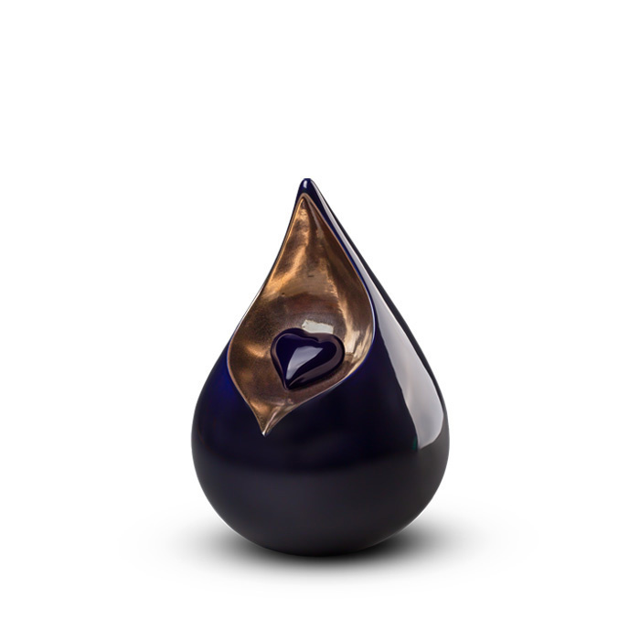 De 'Teardrop met hartje donker mini urn - keramiek' is een prachtige keramische mini urn in een donkere blauw/ paarsachtige kleur, met een moderne uitstraling. Deze fraaie en symbolische urn in de vorm van een traan, oftewel druppel, is 16 cm hoog, met een inhoud van 0,40 L en weegt 0,40 Kg. De 'Teardrop met hartje donker mini urn - keramiek' symboliseert de tranen die gepaard gaan met het verlies van een geliefde. Deze prachtige mini urn staat dan ook symbool voor verlies, verdriet, maar ook voor liefde en troost. In de traanurn is tevens een klein hartje geplaatst, voor een liefdevolle herinnering.