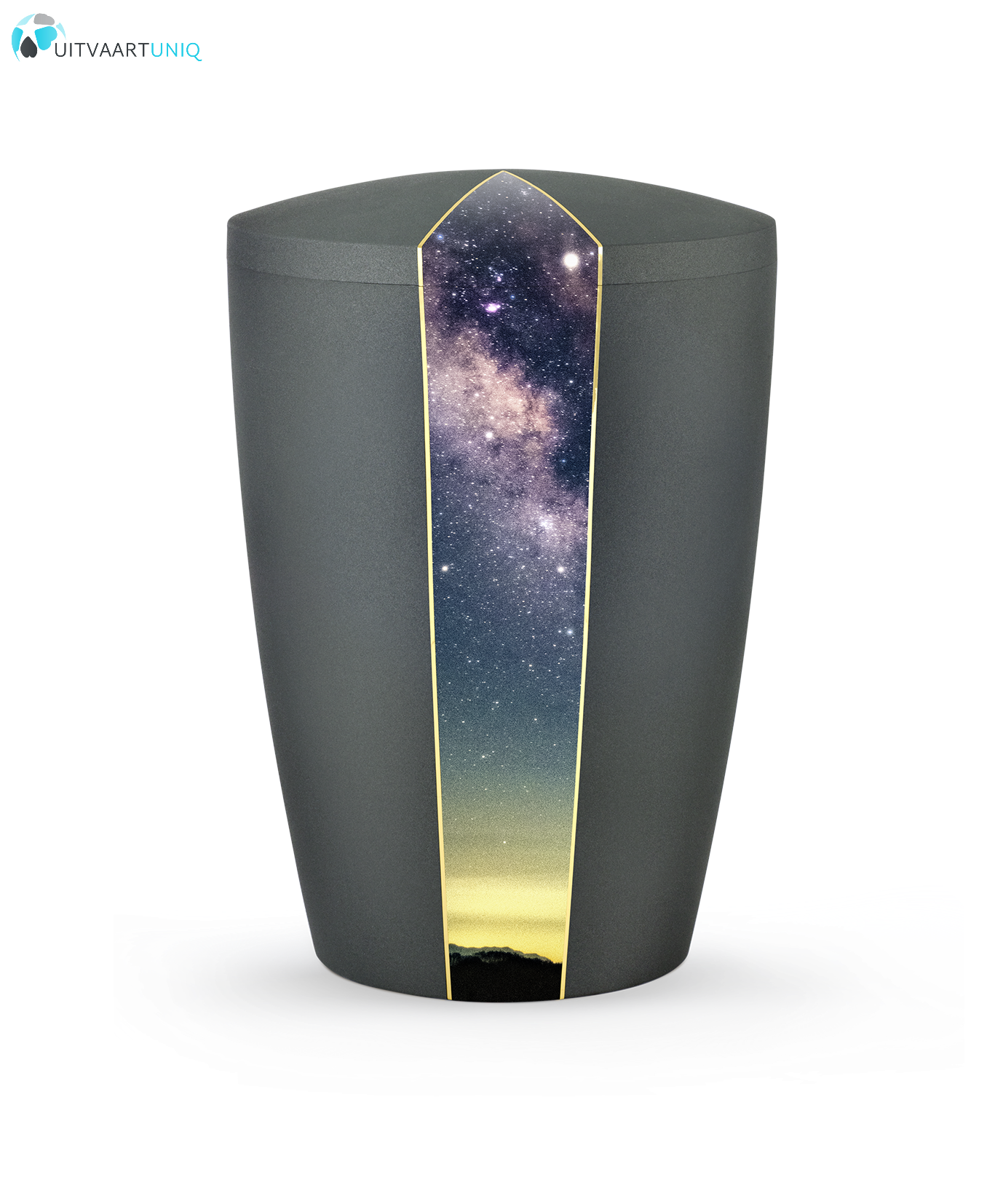De 'Urn fluweel sterrenhemel - bio' is aan de voorzijde voorzien van een prachtig afbeelding. De urn is 27.5 cm hoog, weegt 0,6 Kg en heeft een diameter van 19.0 cm. De inhoud van deze moderne urn is veelal geschikt voor het bewaren van de volledige hoeveelheid as van uw overleden dierbare.