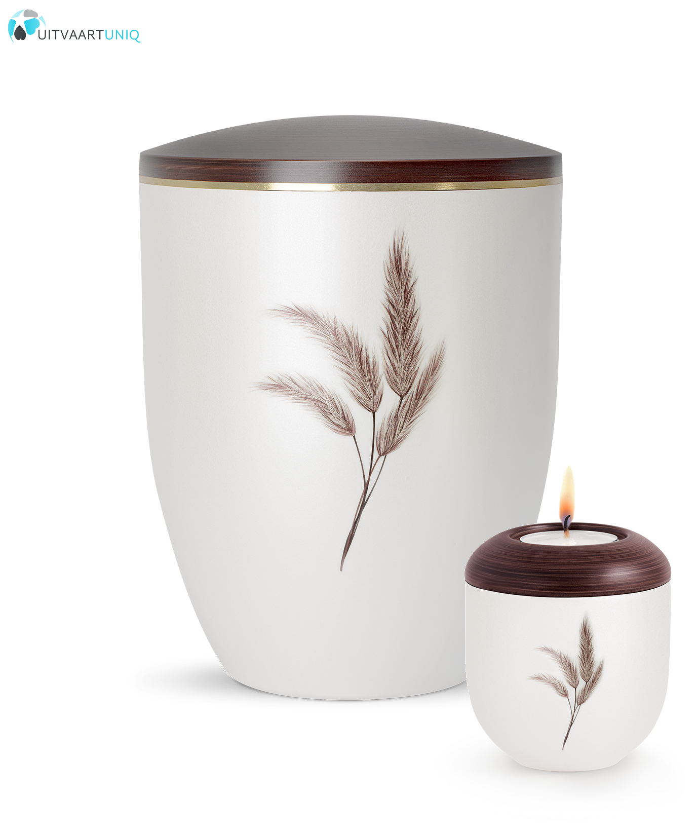 De 'Urn Parlemoer Pampasgras' - bio is aan de voorzijde voorzien van een prachtig afbeelding. De urn is 25 cm hoog, weegt 0,6 Kg en heeft een diameter van 18,5 cm. De inhoud van deze urn is veelal geschikt voor het bewaren van de volledige hoeveelheid as van uw overleden dierbare.