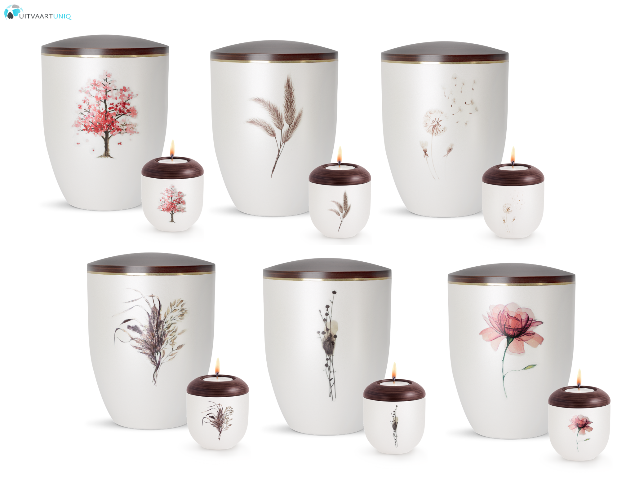 Ook leverbaar: een mini urn met kaarsje in dezelfde stijl. Het is een prachtige optie voor wie op zoek is naar een kleinere herdenkingsmogelijkheid. U kunt ook een kleine hoeveelheid as bewaren als er voor gekozen zou worden de grotere biologisch afbreekbare urn terug te geven aan de aarde.