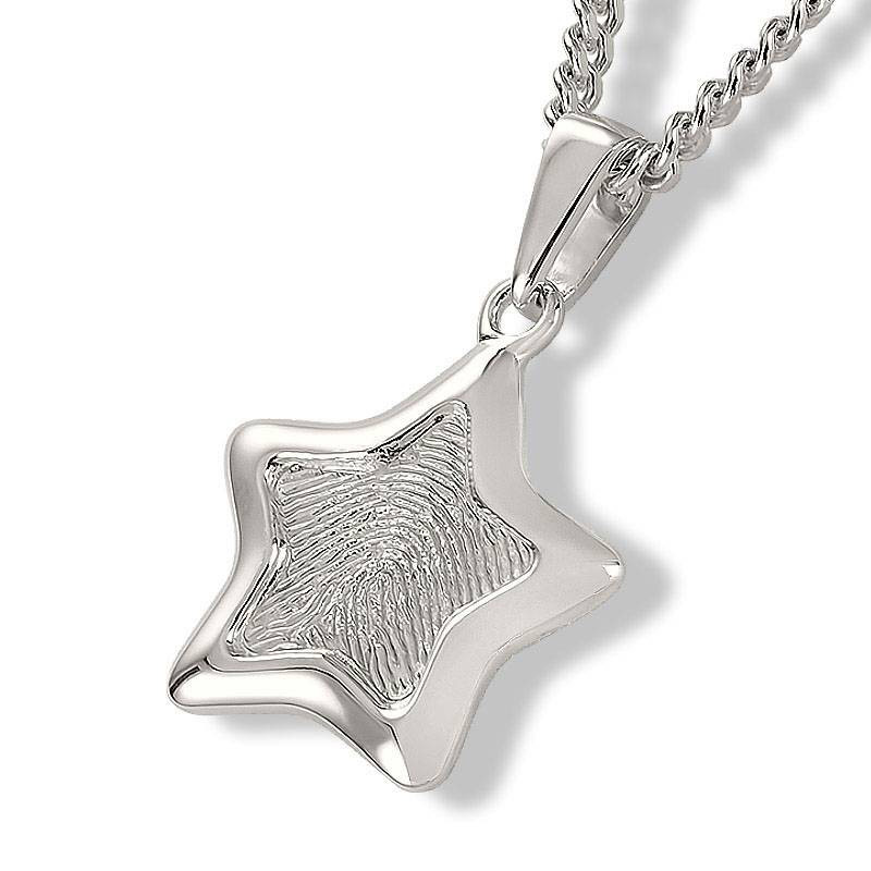 De Vingerafdruk hanger ster - 925 Zilver is een prachtige zilveren hanger in de vorm van een ster, voor een persoonlijke & liefdevolle herinnering aan uw overleden dierbare. Dit bijzondere sieraad is speciaal ontworpen voor het toevoegen van een vingerafdruk - fingerpint van uw geliefde dierbare. De vingerafdruk geeft een bijzonder accent aan het sieraad en staat dan ook centraal binnen het ontwerp van deze mooie zilveren hanger. Een uniek assieraad met een mooie afwerking.