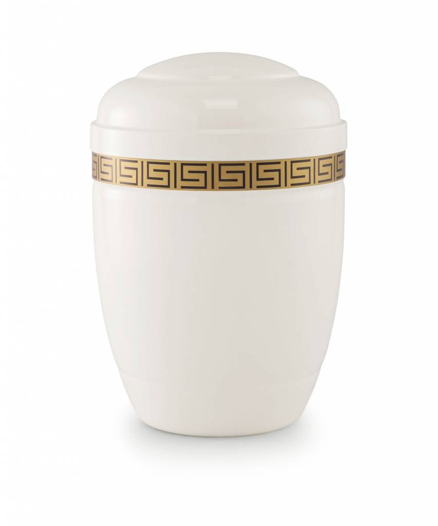 De 'Witte meander asbus - staal' is een mooie stalen urn met een traditionele vormgeving, prachtig in haar eenvoud. De basiskleur van deze stalen urn is wit, waarbij aan de bovenkant een mooie goudkleurige dekoratieve meander sierring toegevoegd is. Deze urn is geschikt voor binnen plaatsing en kan voorzien worden van een persoonlijke inscriptie.
