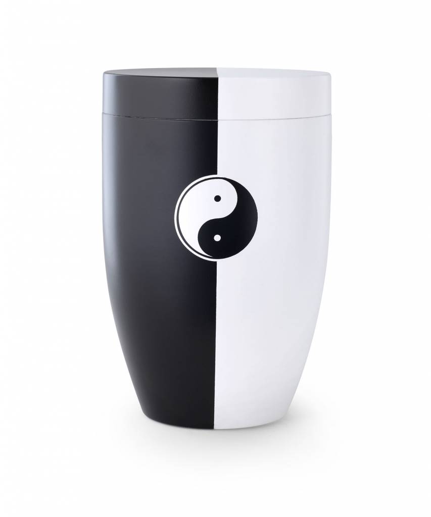 De prachtige Yin-Yang urn - staal combineert een klassieke vormgeving met de prachtige symboliek van het welbekende 'Yin-Yang symbool'. yin en Yang zijn Chinese begrippen die verwijzen naar wee tegengestelde principes of krachten, waarvan alle aspecten van het leven en het universum doordrongen zijn. Zo staat de Yin voor bijvoorbeeld de aarde, waarbij de Yang staat voor de hemel. Een prachtige symboliek voor een dierbare herinnering aan uw overleden dierbare. Deze urn is ruim 27 cm hoog, heeft een diameter van 25,5 cm en weegt in totaal 1,3 Kg. U kunt deze stalen urn binnen plaatsen.